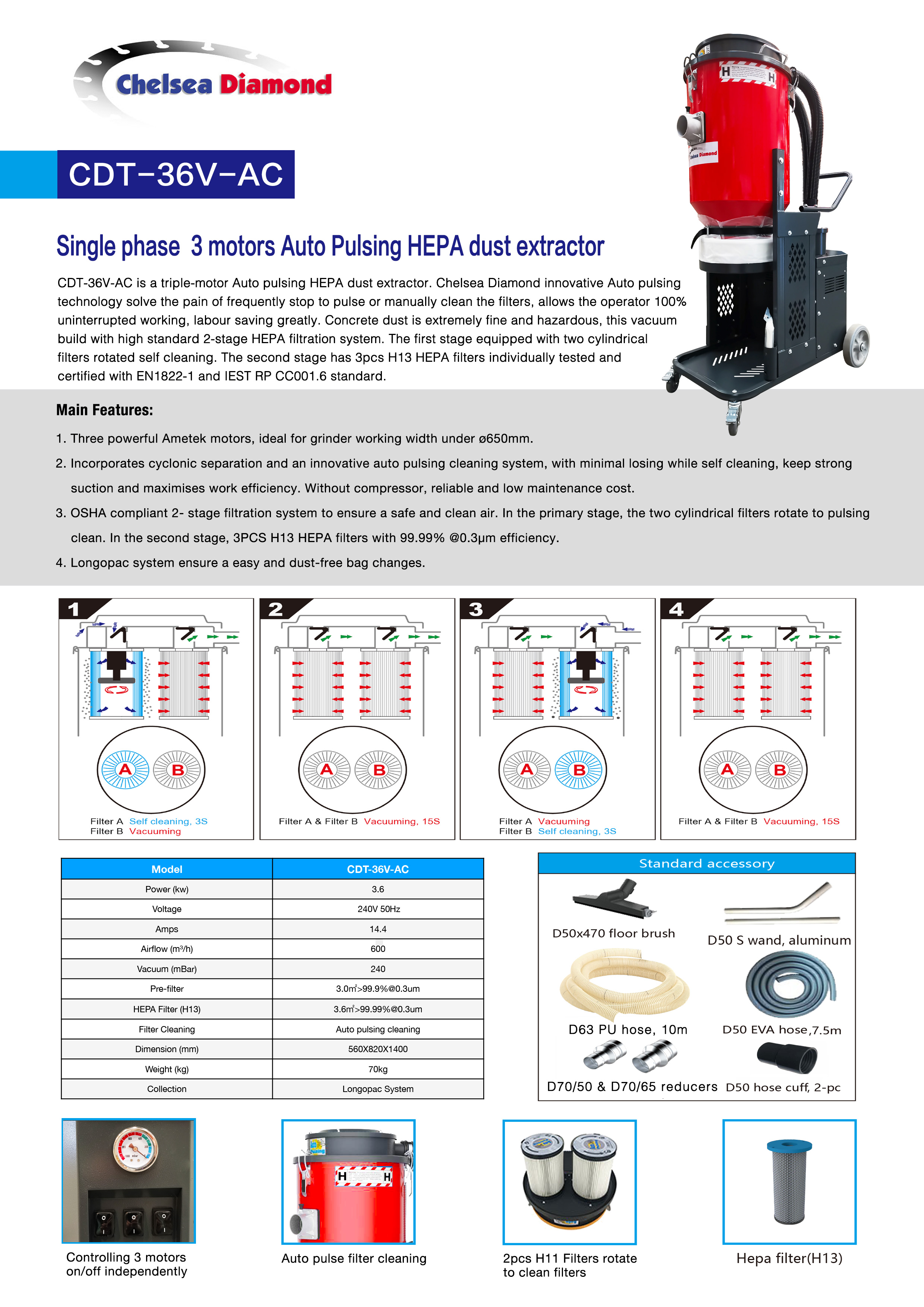 CDT-36V-AC is a triple-motor Auto pulsing HEPA dust extractor. Chelsea Diamond innovative Auto pulsing technology solve the pain of frequently stop to pulse or manually clean the filters, allows the operator 100% uninterrupted working, labour saving greatly. Concrete dust is extremely fine and hazardous, this vacuum build with high standard 2-stage HEPA filtration system. The first stage equipped with two cylindrical filters rotated self cleaning. The second stage has 3pcs H13 HEPA filters individually tested and certified with EN1822-1 and IEST RP CC001.6 standard.