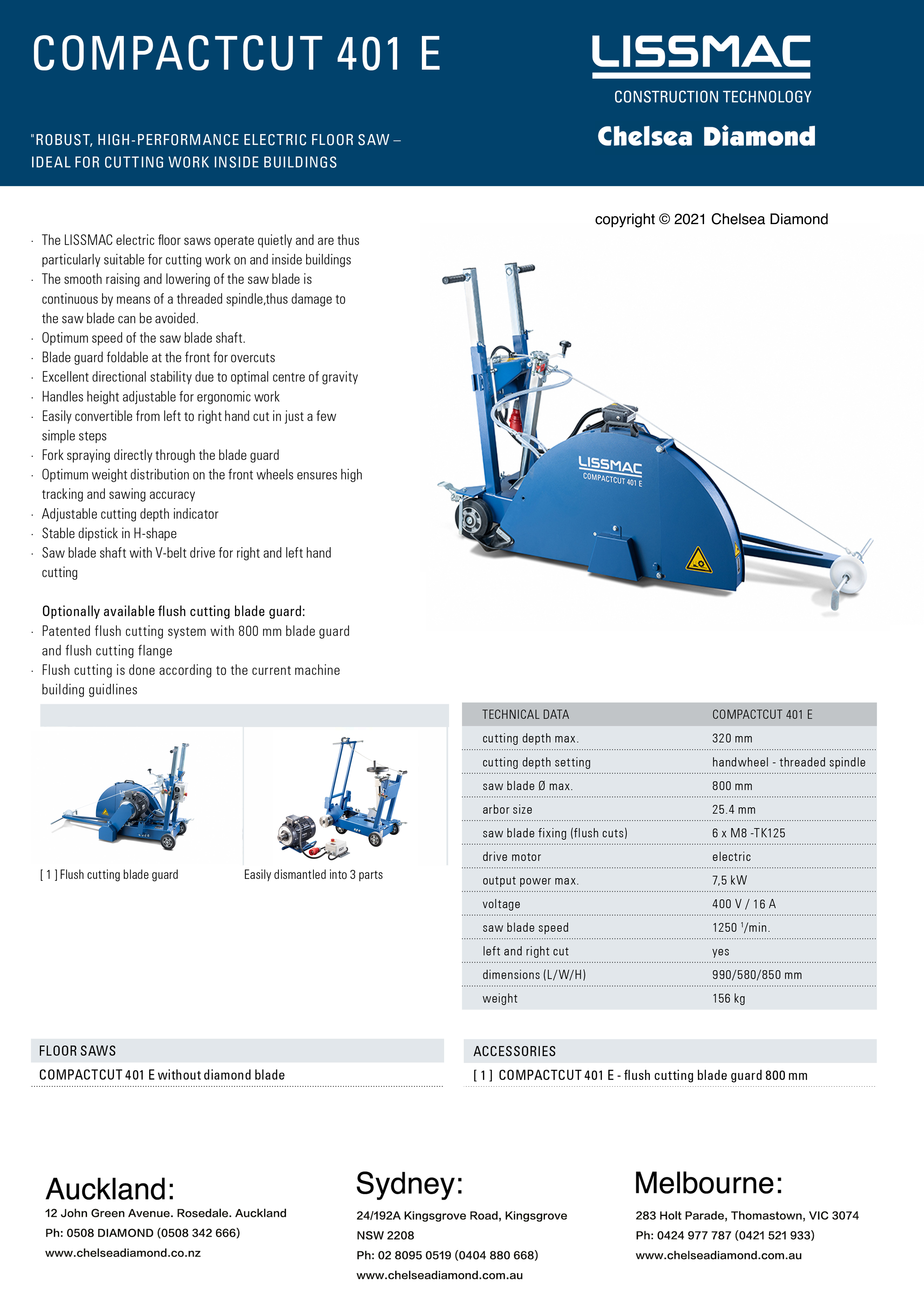 Lissmac CompactCut 401E Electric floor saw 7.5Kw/400V/16A, ø800 Cap. Max.depth 320mm. 1,250 rpm. Complete with ø800 guard. 156Kg