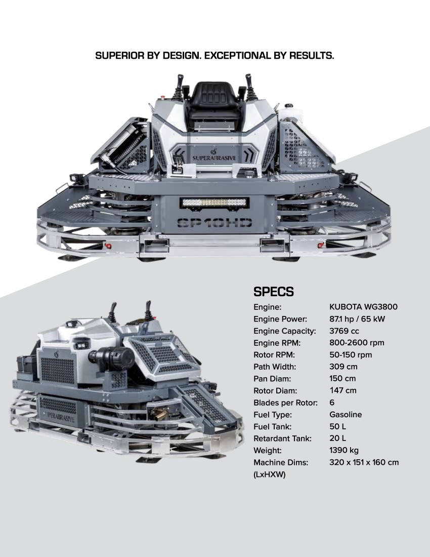 - Weighing 3064 lbs, the SP10HD delivers a surface pressure of 1.84 psi, ensuring optimal slab compaction and superior finishing quality.